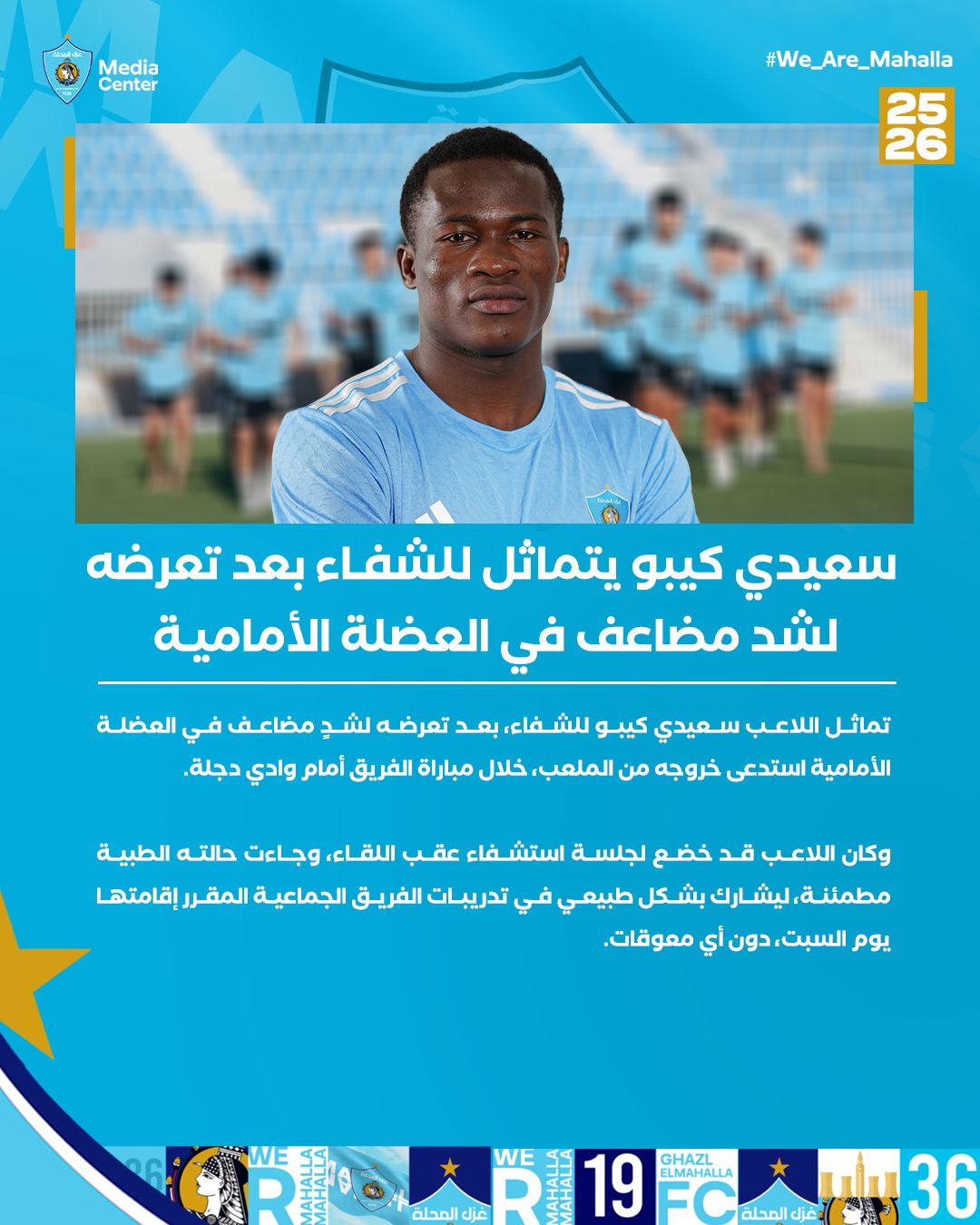 تماثل الإيفواري سعيدي كيبو، لاعب غزل المحلة، للشفاء بشكل كامل بعد الإصابة التي تعرض لها خلال مواجهة فريقه أمام وادي دجلة، والتي تمثلت في شدٍّ مضاعف بالعضلة الأمامية، وأجبرته على مغادرة الملعب وعدم استكمال اللقاء.