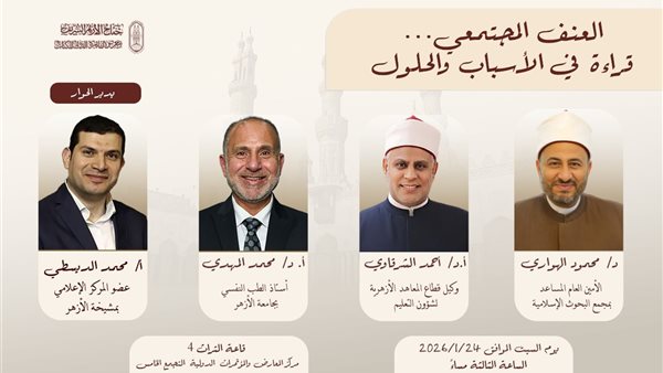 كما يقيم جناح الأزهر ندوة بعنوان «العنف المجتمعي… قراءة في الأسباب والحلول»، بمشاركة الدكتور محمد المهدي أستاذ الطب النفسي بجامعة الأزهر، والدكتور محمود الهواري الأمين العام المساعد بمجمع البحوث الإسلامية، والأستاذ الدكتور أحمد الشرقاوي وكيل قطاع المعاهد الأزهرية لشؤون التعليم، ويدير الندوة الإعلامي محمد الديسطي عضو المركز الإعلامي بمشيخة الأزهر، حيث تناقش الندوة الظاهرة من أبعادها النفسية والاجتماعية والتربوية، وسبل مواجهتها وبناء مجتمع أكثر تماسكًا.