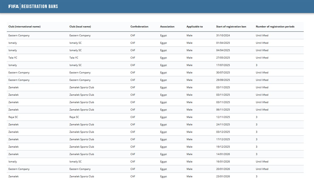 وأصبح إجمالي القضايا والعقوبات الموقعة ضد الزمالك، 10 قضايا، 4 منهم لحين الدفع إلى جانب 6 قضايا أخرى لمدة 3 فترات قيد، حسب موقع الاتحاد الدولي لكرة القدم.