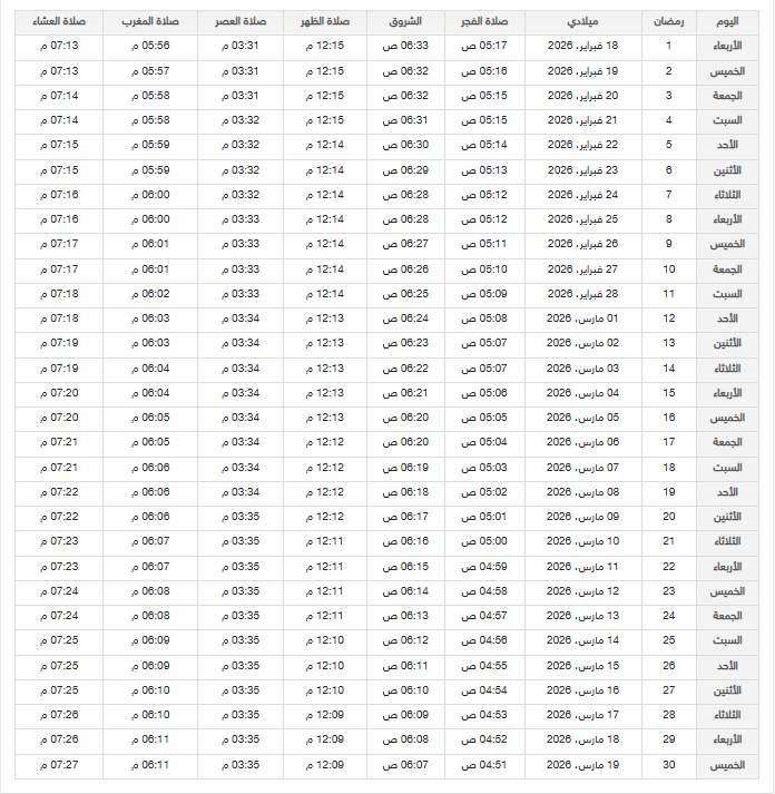 وفيما يلي نعرض إمساكية رمضان 2026 السعودية بتوقيت الرياض، وفقا للحسابات الفلكية، وقد تختلف فقط في تحديد أول أيام الصيام وفقا لرؤية الهلال: