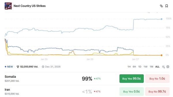 أظهر استطلاع أجرته منصة بوليماركت، المتخصصة في أسواق المراهنات القائمة على العملات المشفّرة، ارتفاعًا حادًا في ترجيحات تعرض الصومال لضربة عسكرية أمريكية، حيث بلغت نسبة التوقع 99% وفقًا لتداولات المستخدمين على المنصة، مقابل أقل من 1% لإيران.