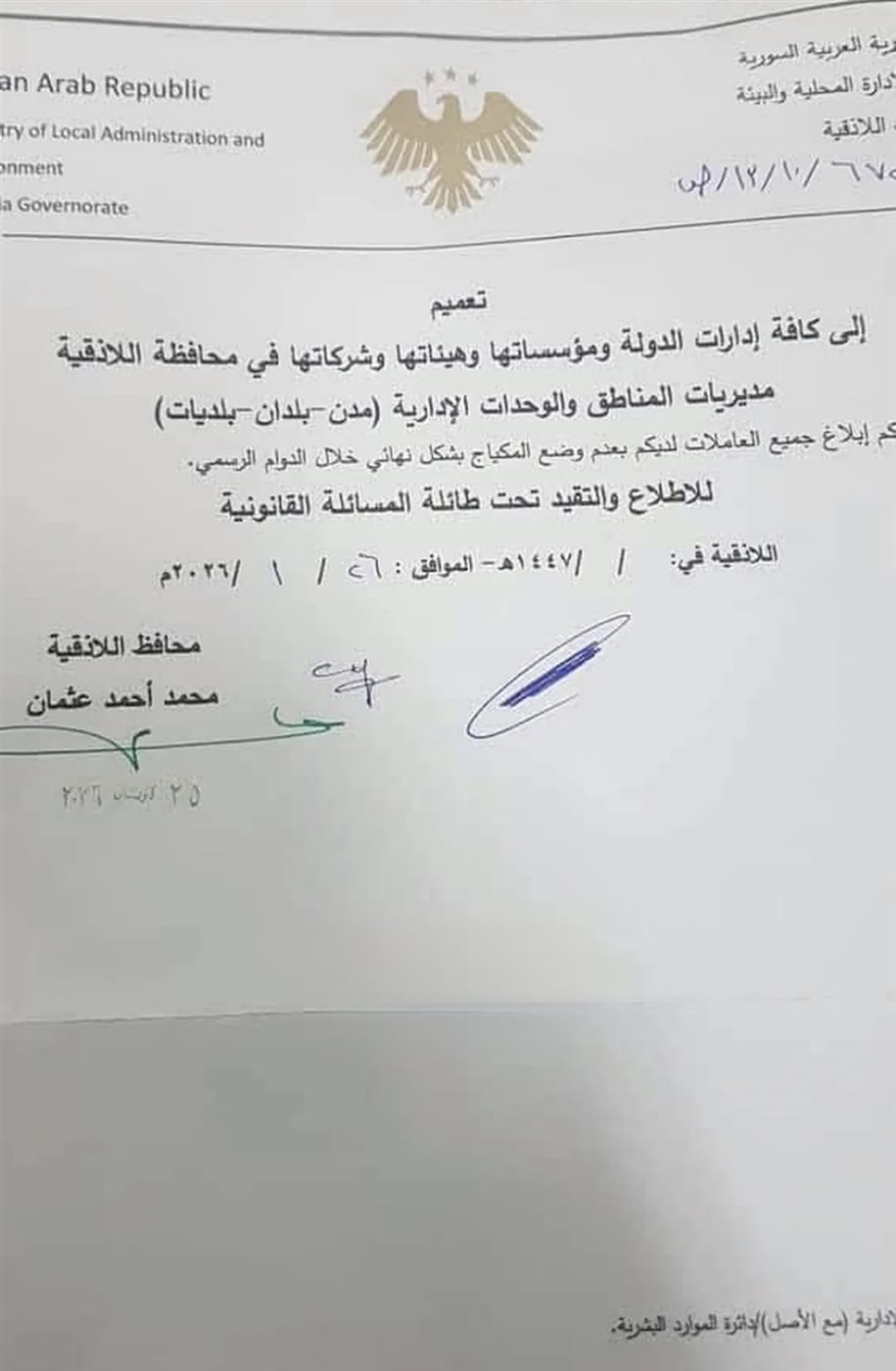 ويلزم التعميم الذي يحمل توقيع محافظ اللاذقية بتاريخ 25 يناير 2026، جميع الجهات العامة بعدم وضع المكياج بشكل نهائي خلال الدوام الرسمي، وهو موجّه إلى إدارات الدولة ومؤسساتها وهيئاتها والشركات التابعة لها في محافظة اللاذقية، بما فيها مديريات المناطق والوحدات الإدارية (مدن، بلدان، بلديات).
