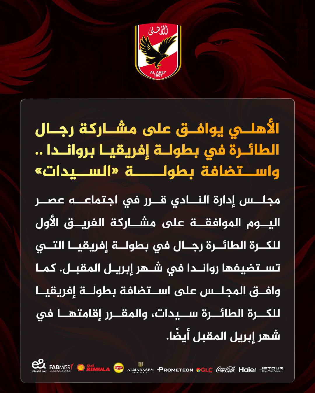 وافق مجلس إدارة النادي الأهلي، خلال اجتماعه الذي عُقد عصر اليوم، على مشاركة الفريق الأول للكرة الطائرة رجال في بطولة إفريقيا للأندية، والمقرر إقامتها في رواندا خلال شهر أبريل المقبل.