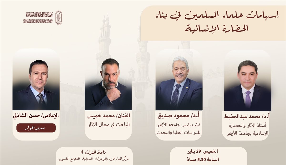 ينظم جناح الأزهر الشريف في الدورة الـ57 من معرض القاهرة الدولي للكتاب، اليوم الخميس، ندوة بعنوان: "إسهامات علماء المسلمين في بناء الحضارة الإنسانية"، يشارك فيها الدكتور محمود صديق، نائب رئيس جامعة الأزهر للدراسات العليا والبحوث، والدكتور محمد عبد الحفيظ، أستاذ الآثار والحضارة الإسلامية بجامعة الأزهر، والفنان محمد خميس، الباحث في مجال الآثار.