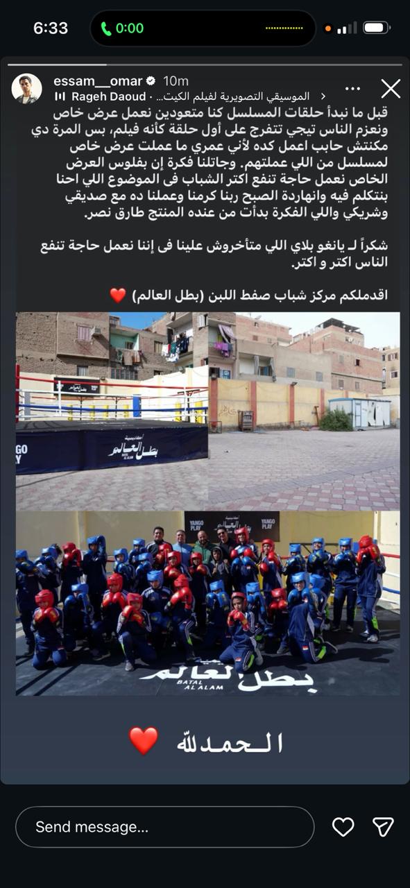 وتابع: جاتلنا فكرة إنه بدل فلوس العرض الخاص نعمل حاجة تنفع الشباب أكتر في نفس الموضوع اللي بنتكلم عنه في المسلسل. والنهارده ربنا كرّمنا وحققنا الفكرة دي مع صديقي وشريكي، واللي الفكرة بدأت من عنده، المنتج طارق نصر، وشكرًا ليانجو بلاي اللي ما اتأخروش علينا في دعم المبادرة وتنفيذها على أرض الواقع، ونقدملكم النهارده مركز شباب.