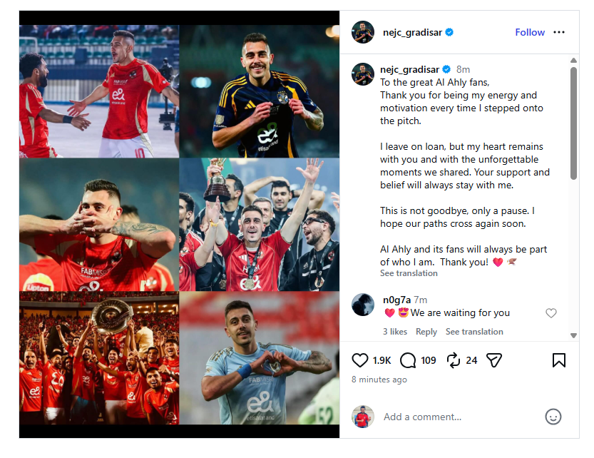 حرص جراديشار، مهاجم النادي الأهلي، على وداع جماهير القلعة الحمراء برسالة مؤثرة عبر حساباته الرسمية على مواقع التواصل الاجتماعي، عقب إعلان رحيله على سبيل الإعارة.