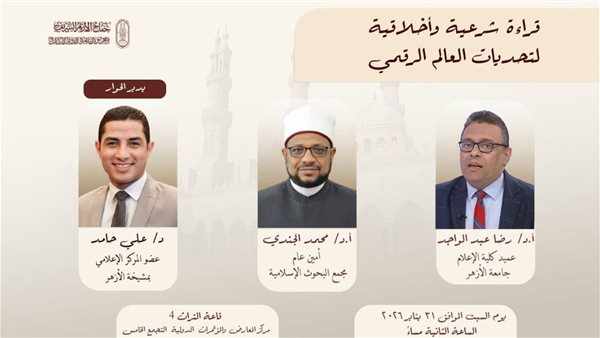 ينظم جناح الأزهر الشريف، ضمن فعاليات معرض القاهرة الدولي للكتاب في دورته السابعة والخمسين، اليوم السبت، ندوة علمية بعنوان «قراءة شرعية وأخلاقية لتحديات العالم الرقمي»، وذلك في إطار مناقشة القضايا المعاصرة المرتبطة بالعالم الرقمي من منظور شرعي وأخلاقي.