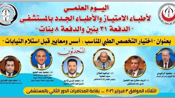 ينظّم مستشفى طب الأزهر الجامعي بأسيوط اليوم العلمي لأطباء الامتياز والأطباء الجدد، وذلك بعنوان: اختيار التخصص الطبي المناسب: أسس ومعايير قبل استلام النيابات، غدًا الثلاثاء الموافق 3 فبراير 2026، بقاعة المحاضرات بالدور الثاني بمستشفى طب الأزهر الجامعي بأسيوط.