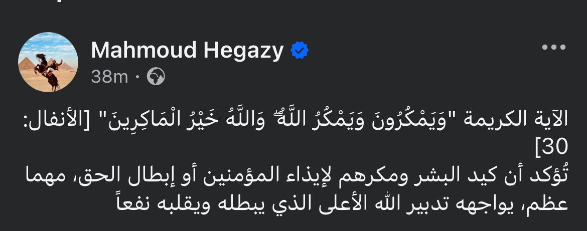 نشرت الصفحة الرسمية للفنان محمود حجازي، على موقع التواصل الاجتماعي فيس بوك منشورًا جاء فيه: الآية الكريمة "وَيَمْكُرُونَ وَيَمْكُرُ اللَّهُ ۖ وَاللَّهُ خَيْرُ الْمَاكِرِينَ"، الأنفال 30، تُؤكد أن كيد البشر ومكرهم لإيذاء المؤمنين أو إبطال الحق، مهما عظم، يواجهه تدبير الله الأعلى الذي يبطله ويقلبه نفعًا.