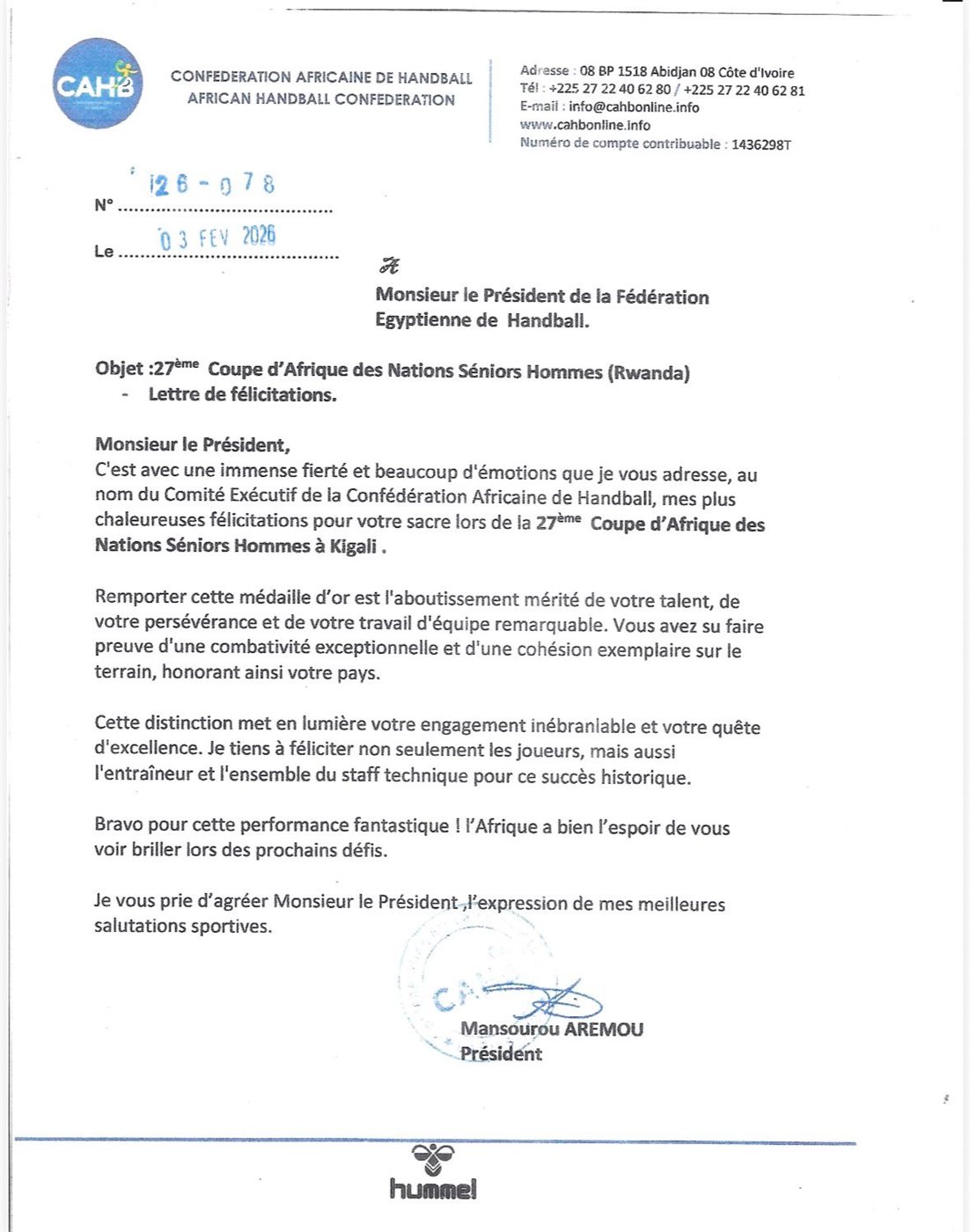 تلقى الاتحاد المصري لكرة اليد، خطاب تهنئة رسمي من الاتحاد الإفريقي لكرة اليد، برئاسة منصور أريمو، بمناسبة تتويج منتخب مصر بلقب بطولة كأس الأمم الإفريقية لكرة اليد للرجال، التي أقيمت مؤخرًا في كيجالي عاصمة رواندا.
