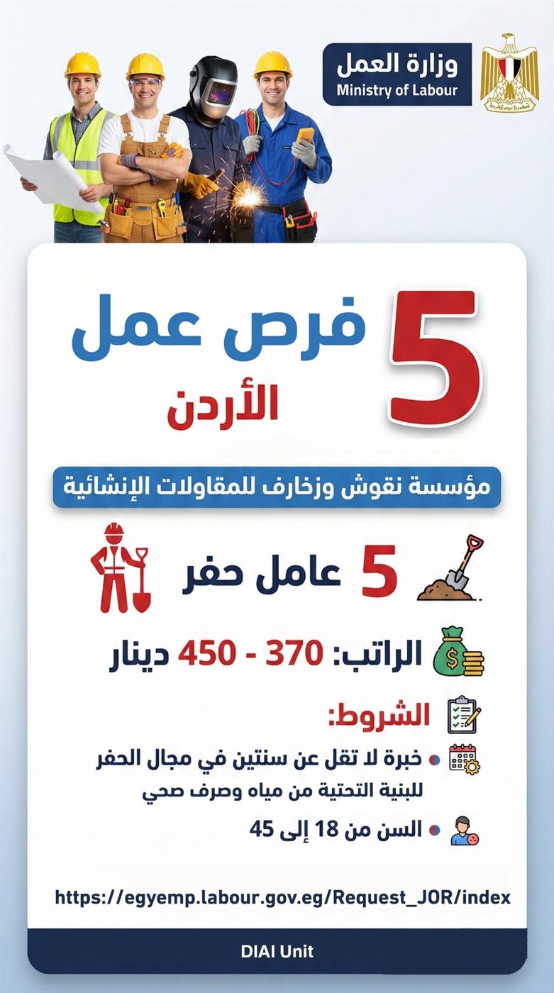 ومن ضمن وظائف خالية جديدة مقدمة من وزارة العمل، أعلنت الوزارة صباح اليوم الأربعاء عن توافر فرص عمل للمصريين، للعمل بالمملكة الأردنية الهاشمية، في ضوء الاتفاق بين الجانبين المصري والأردني على تسهيل إجراءات التشغيل ومكافحة ظاهرة السمسرة، وذلك بالتنسيق مع المكتب العمالي بالأردن برئاسة محمود فهمي.