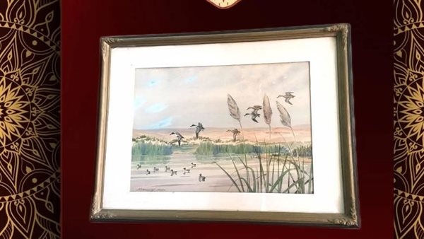 ومن بين أبرز هذه المقتنيات لوحة فنية نادرة مرسومة بالألوان المائية، تمثل منظرًا طبيعيًا لجزيرة تقع وسط المياه، تتناثر فيها النباتات الخضراء وتخترقها أعواد الغاب في تناغم بصري يعكس جمال الطبيعة وهدوءها.