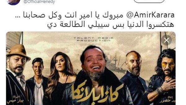 وداعب هنيدي كرارة ومتابعيه أيضا، وذلك باستبدال وجه بطل الفيلم بصورة ظهر خلالها بهيئة كوميدية، باستخدام أحد برامج الفوتوشوب، وعلق عليها قائلا: ” مبروك يا أمير انت وكل صحابنا هتكسروا الدنيا بس سيبلي الطالعة دي”.