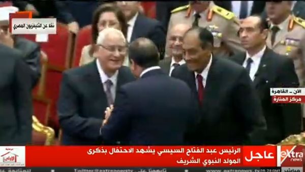 قال الرئيس عبد الفتاح السيسي: “هقول كلام معرفش فخامة الرئيس عدلي منصور هيزعل مني ولا لا، بس أن هقوله”، موضحاً أنه قبل الانتخابات الرئاسية التي تمت بعد ثورة يونيه، تساءل الجميع لماذا لم أقدم أوراق ترشحي؟. وأوضح الرئيس السيسي، خلال كلمته باحتفالية المولد النبوي، أنه ظل لمدة شهور يقنع الرئيس عدلي منصور بالترشح ويظل هو وزير الدفاع، إلا أنه رفض.. والكل زاهد فيها”.
