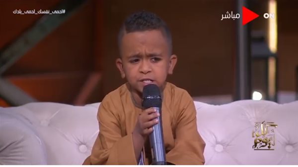 وقال الطفل، إنه يحب الفنان محمد منير كثيراً ويتمنى الغناء معه في “دويتو”، فعندما طلبت منه الإعلامية توجيه رسالة له، قال: “أحب أغني معه”.